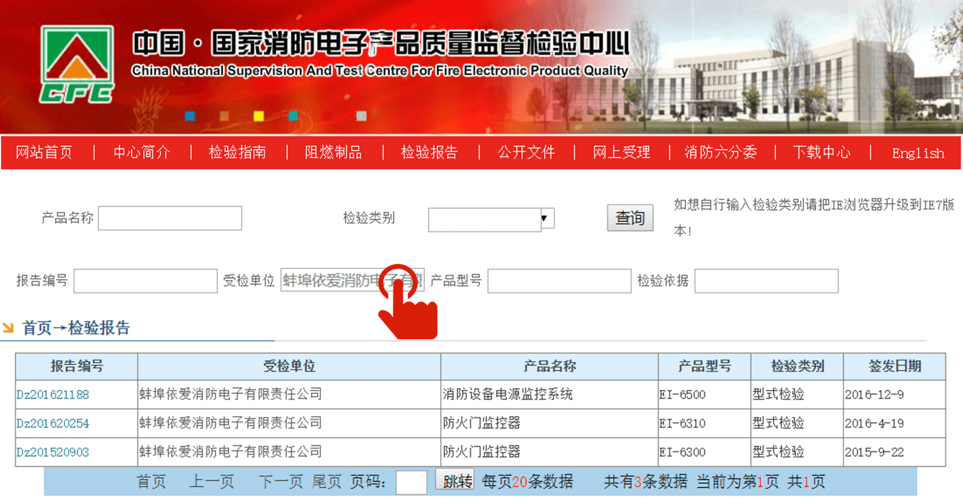 Masukkan nama perusahaan untuk ditanyakan pada "unit yang diperiksa", seperti "Yiyi Ai Fire Electronics Co., Ltd.", dan kemudian Anda dapat melihat informasi produk perusahaan yang telah lulus inspeksi.