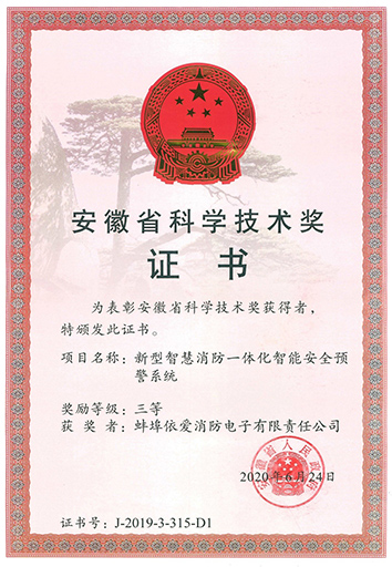 2020年629日上午,安徽省科學(xué)技術(shù)獎(jiǎng)勵(lì)大會(huì)在合肥隆重召開。由依愛消防研制的“新型智慧消防一體化智能安全預(yù)警系統(tǒng)”項(xiàng)目獲得安徽省科技進(jìn)步三等獎(jiǎng)。